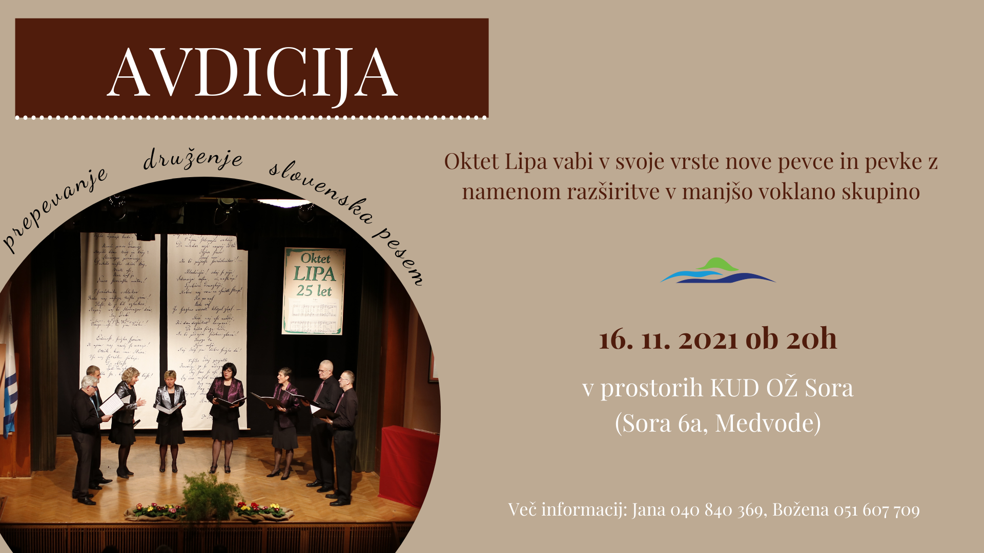 KUD Oton Župančič Sora - Oktet Lipa vabi v svoje vrste nove pevke in pevce z namenom razširitve okteta v manjšo vokalno skupino.