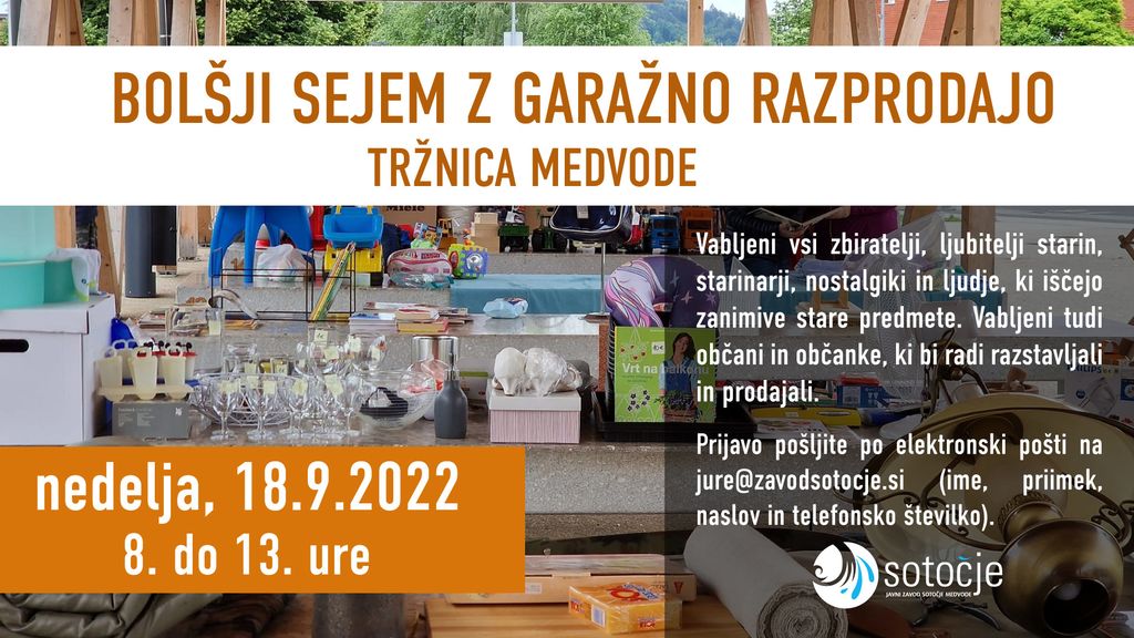 V nedeljo, 18. septembra, vas od 8. do 13. ure zopet vabimo na boljši sejem z garažno razprodajo. Pridite kot obiskovalci oz. razstavljavci - svoje prodajno mesto si lahko rezervirate s poslanimi podatki (ime, priimek, naslov, telefonska številka) na mail jure@zavodsotocje.si. Prijave so možne do petka, 16.9. do 12. ure.