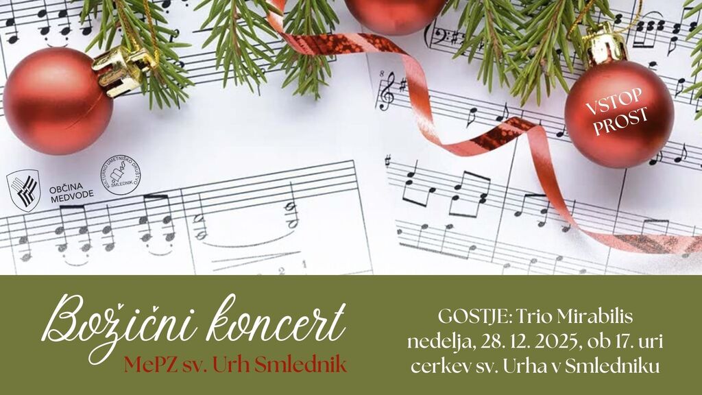 MePZ sv. Urh Smlednik vabi na tradicionalni letni koncert božičnih pesmi, ki bo v nedeljo, 28. decembra, ob 17. uri, v župnijski cerkvi sv. Urha v Smledniku.