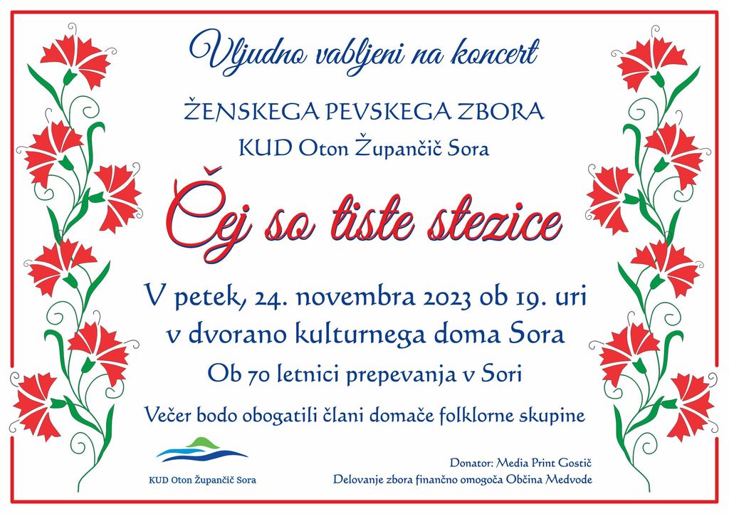 Vljudno vabljeni na koncert Ženskega pevskega zbora KUD Oton Župančič Sora, ki bo potekal v petek 24. 11. ob 19.00 uri v dvorani KD Sora.