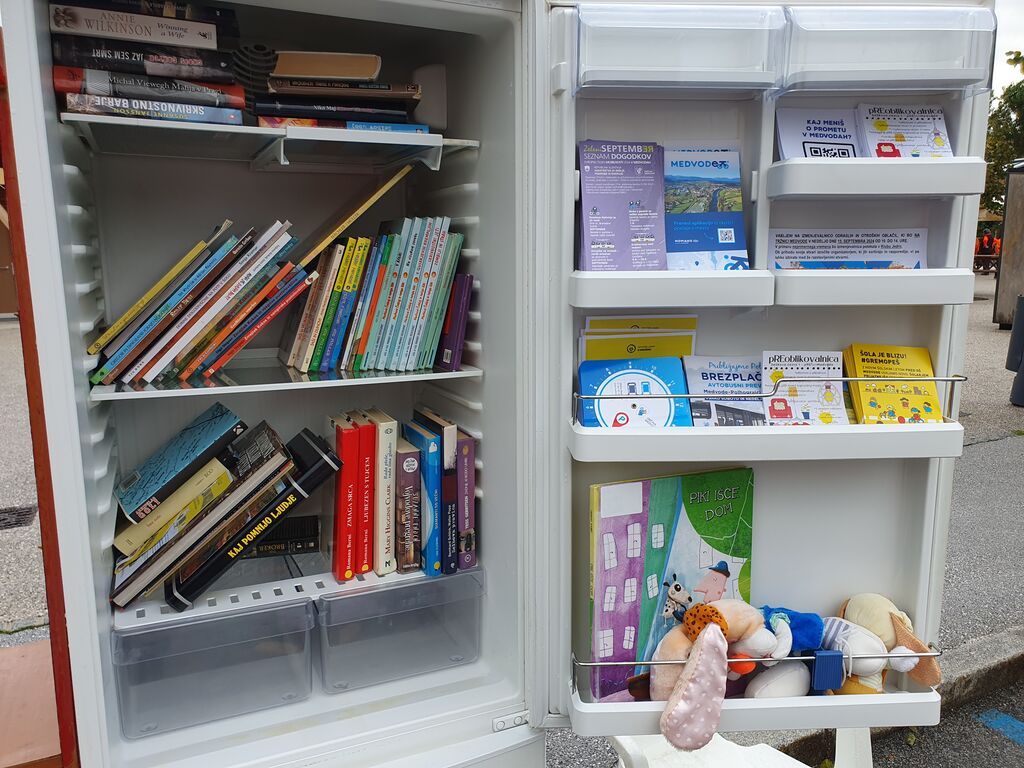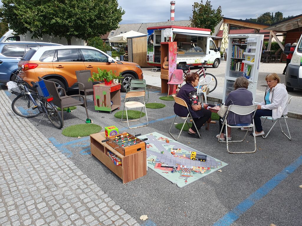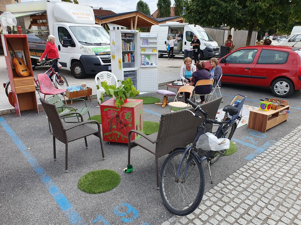 Na parkiriščih tržnice bomo med osebnimi vozili ustvarili poseben otoček iz starega pohištva, ki si ga bomo izposodili v občinskem zbirnem centru odpadkov – po uporabi ga bomo tja tudi vrnili. V hladilnik, ki bo v tem prostoru, knjižnica vnese tudi mobilno bralno polico. Tako postrežemo s kontrastnim vpogledom na stanje avtomobilske pločevine, ki se gnete med prostori, ki bi lahko bili trajneje namenjeni prijetnejšim, čistejšim in bolj zdravim vsebinam, predvsem pa pešcem in kolesarjem. Obiskovalci urbanega središča bodo lahko ob tej demonstraciji o svojih potovalnih navadah ponovno razmislili.
