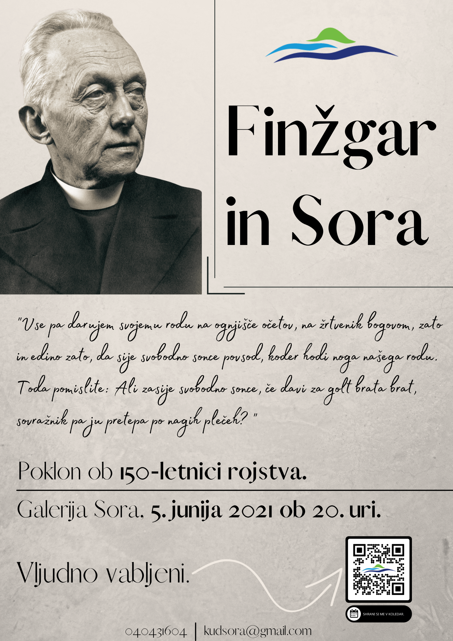 Ob 150. obletnici rojstva Frana Saleškega Finžgarja, pisatelja in duhovnika, ki je med leti 1908 in 1918 služboval tudi v Sori, Kulturno umetniško društvo Oton Župančič Sora prireja razstavo posvečeno njegovemu življenju, delu in pečatu, ki ga je pustil pri nas v Sori.