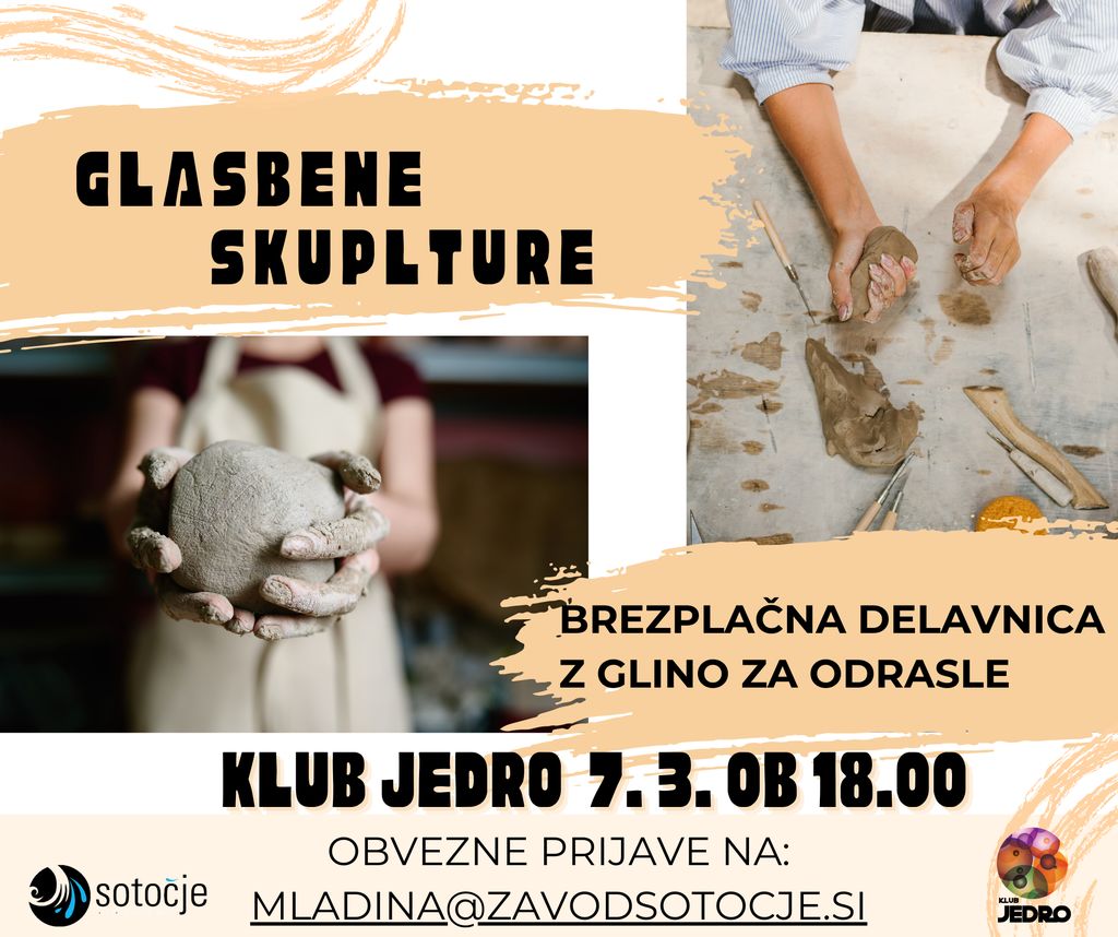 V Kubu Jedro bodo potekale brezplačne delavnice z glino za odrasle. Obvezne prijave na: mladina@sotocje.si.