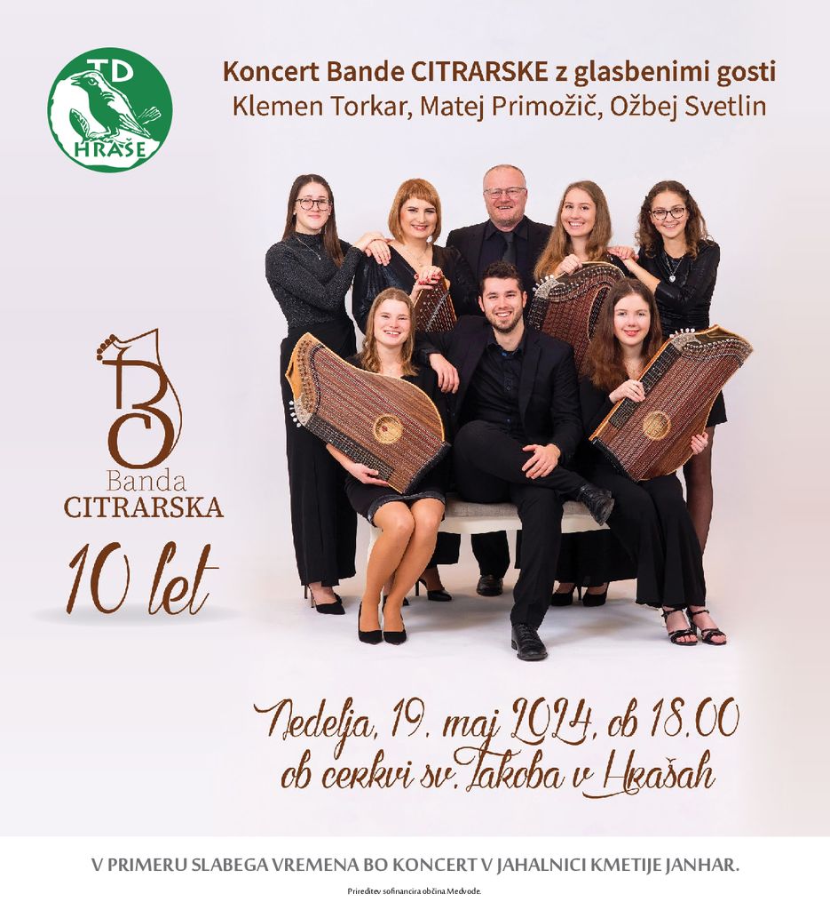 V nedeljo, 19. maja 2024, ob 18h vas vljudno vabimo k cerkvi sv. Jakoba v Hrašah na koncert glasbene skupine Banda CITRARSKA. Pridružili se jim bodo gosti: Klemen Torkar, Matej Primožič in Ožbej Svetlin.