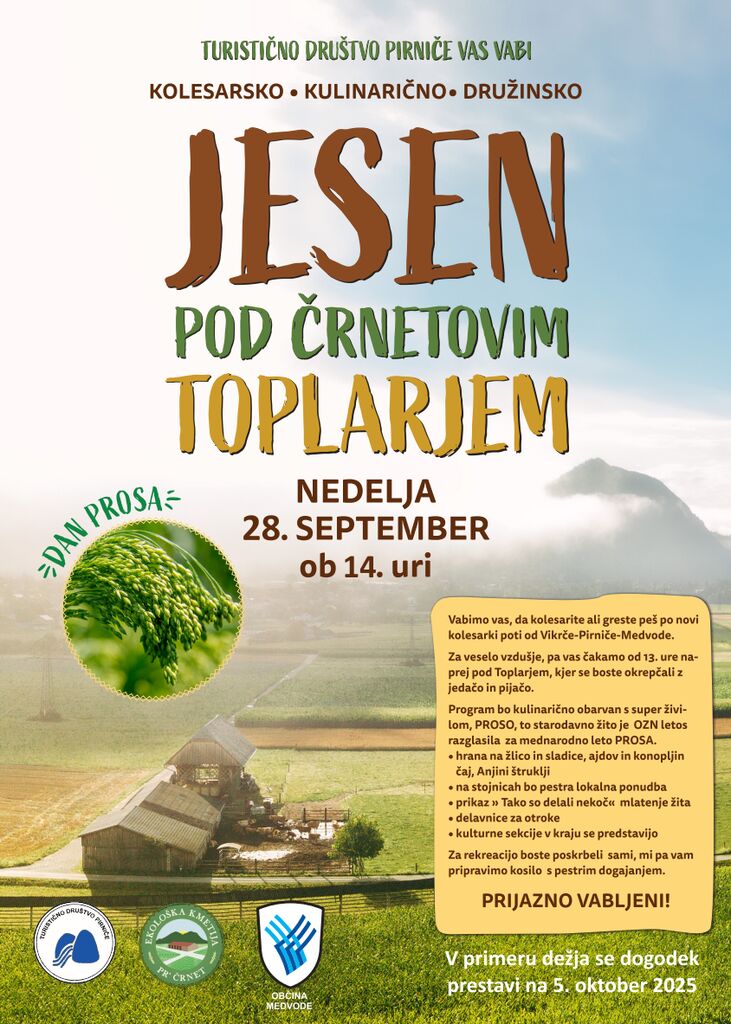 Vljudno vabljeni na tradicionalno prireditev "Jesen pod Črnetovim toplarjem" v nedeljo, 28.9.2025 s pričetkom ob 14.00 uri. V primeru slabega vremena bo prireditev 5.10. 2025 ob isti uri. Predstavili bomo kulinarično ponudbo na temo prosa, predstavili stare ljudske običaje, otroške delavnice, poslikavo obrazov, ljudskim petjem in drugo. Na dogodku se bodo predstavili lokalni kmetje in pridelovalci domačih izdelkov in lokalnr ponudbe.