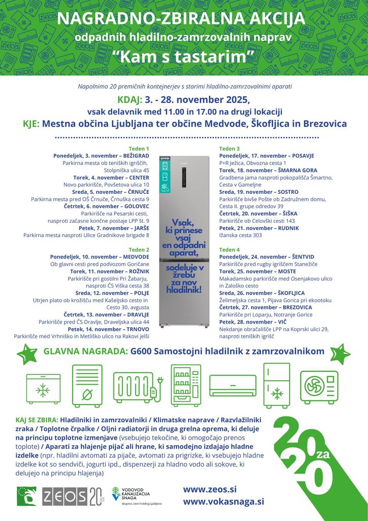 ZEOS, d.o.o. v sodelovanju z JP VOKA SNAGA d.o.o. organizira v novembru 2025 posebno zbiralno akcijo za odpadne hladilno-zamrzovalne aparate. Akcija bo potekala od 3. do 28. novembra 2025, vsak delovni dan med 11. in 17. uro, na 20 različnih lokacijah v Mestni občini Ljubljana in v občinah Medvode, Škofljica ter Brezovica. Vsak sodelujoči, ki v akciji na eni od zbirnih točk odda vsaj eno napravo, prejme promocijsko darilo, hkrati pa se lahko poteguje za glavno nagrado - nov hladilnik. V sklopu akcije se iščejo tudi hladilno-zamrzovalne naprave, ki so stare ravno 20 let, saj je akcija ena od aktivnosti, s katerimi obeležujejo 20 let delovanja družbe ZEOS. Več o nagradni igri se nahaja na www.zeos.si.