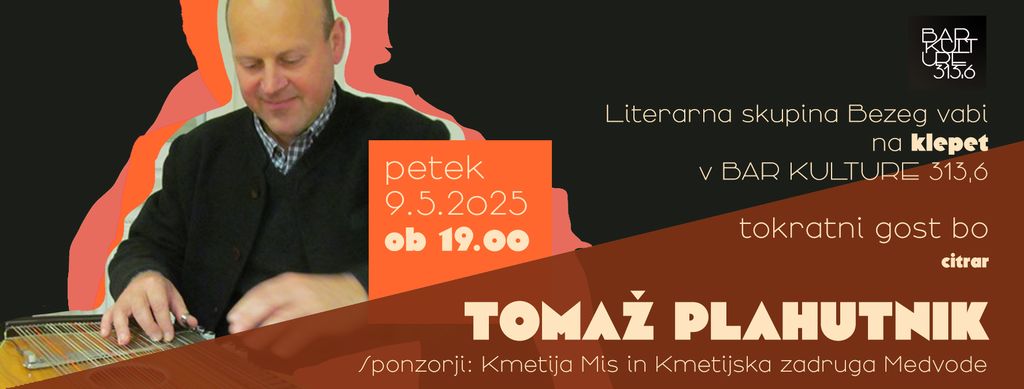 Literarna skupina Bezeg vabi na klepet v Bar kulture 313,6 v petek, 9. 5. 2025 ob 19.uri. Tokratni gost bo citrar TOMAŽ PLAHUTNIK.