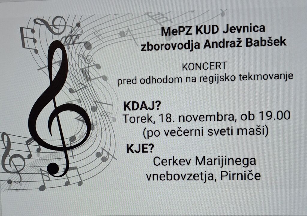 Me PZ KUD Jevnica vas vabi na koncert pred odhodom na regijsko tekmovanje. Koncert bo 18.11.2025 po maši, ob 19.00 v cerkvi v Zgornjih Pirničah.