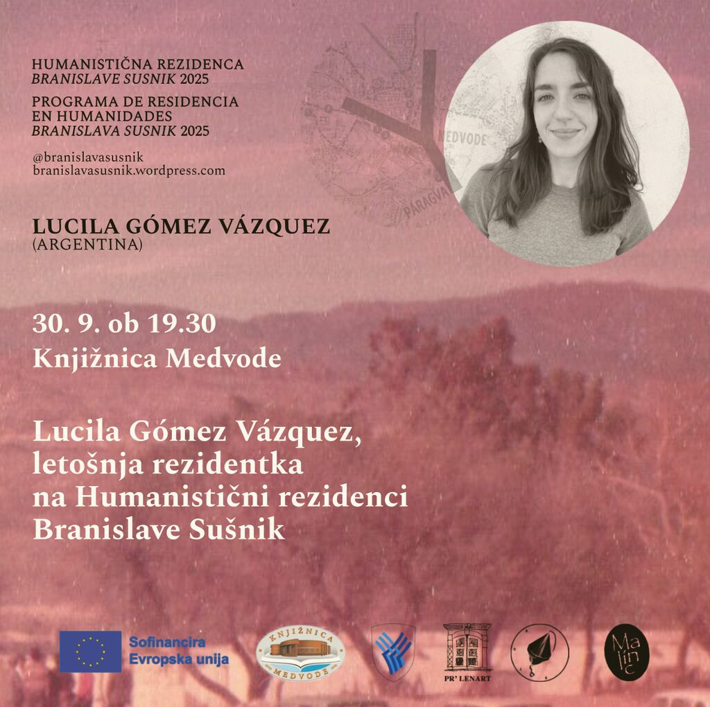 V okviru četrtega rezidenčnega razpisa Humanistične rezidence Branislave Sušnik (https://branislavasusnik.wordpress.com/residencia/) bo v času med 16. septembrom in 1. oktobrom 2025 v Medvodah bivala Lucila Gómez Vázquez. Na srečanju v medvoški knjižnici bo predstavila svoje dosedanje delo, predvsem pa umetniškoantropološko delo, ki ga je v okviru projekta opravila v Medvodah. Vabljeni, da na svoj kraj pogledate z očmi drugega, tokrat argentinske antropologinje, umetnice in predavateljice Lucile Gómez Vázquez.