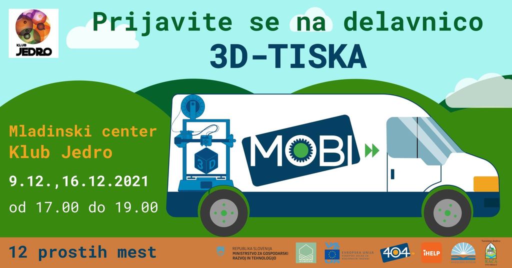 Projekt MOBI v sodelovanju s Klubom Jedro, v Medvodah organizira delavnico 3D-tiska. Ogledali si bomo kaj 3D-tiskalnik je in kako deluje. Naučili se bomo kako zamenjati filament, kje lahko dobimo najrazličnejše 3D-modele in kako modele pripravimo na tisk. Vsak izmed udeležencev bo lahko preizkusil 3D-tiskalnik in natisnil svoj lasten model. Da bodo na vrsto prišli vsi, bo delavnica potekala v dveh srečanjih.