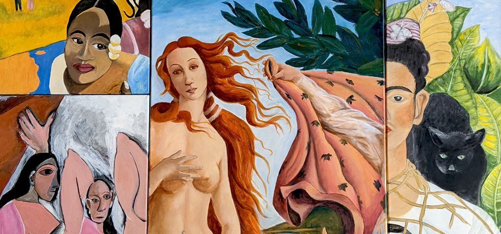 Leta 2020, tik pred začetkom t.i. koronačasa, smo oblikovale idejo o razstavi skupinskih slik, neke vrste slikarskih sestavljank. Za motiv smo si izbrale žensko in se odločile za poustvarjanje del znanih slikarjev. Ustvarjanje takšnih del je nekoliko bolj lahkotno, a hkrati odlična priložnost za učenje in urjenje opazovanja, gradnje slike itd. Razdelile smo si delo in pričele s samostojnim ustvarjanjem. Zaradi korone smo dela v večini ustvarjale vsaka pri sebi doma. Čeprav smo »kopirale«, ne gre za reprodukcije. Vsak košček, samostojni del slike, ima svoje individualne značilnosti, izraz, ki je pečat vsake posamezne ustvarjalke. Pri ustvarjanju smo sledile predlogi in si hkrati dovolile toliko svobode, kot nam jo je naloga dopuščala. Ko smo delčke postavile drug ob drugega in ko so se linije stekle, so se dela čudovito in fascinantno povezala v celoto. Na nek svojstven način so ponovno povezala tudi nas. Vesele smo, da je razstava končno tukaj tudi za vas. Vsa dela so ustvarjena v tehniki akril na platnu. In čeprav so na slikah upodobljena ženska telesa, je naša želja predvsem ta, da se z razstavo poklonimo umetnosti in preko nje ženski energiji, duši, naravi. Kjerkoli se že nahaja in v kakršnikoli obliki.