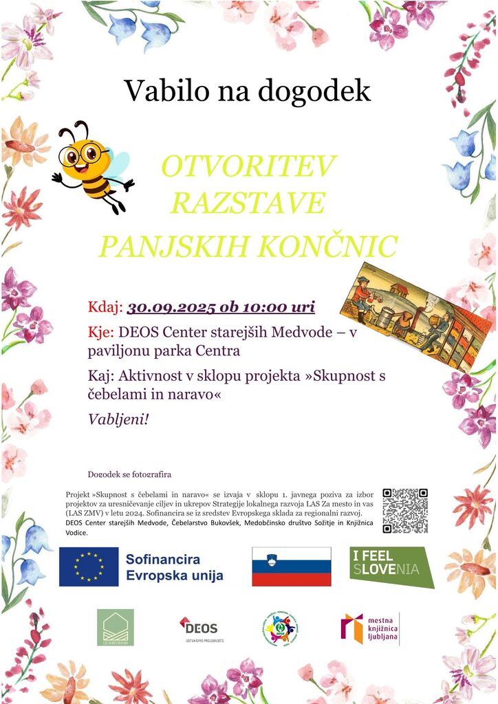 V okviru projekta ˝Skupnost s čebelami in naravo˝ vas vabimo na dogodek Otvoritev razstave panjskih končnic, ki bo potekal v parku oz. paviljonu DEOS Centra starejših Medvode. Panjske končnice so v preteklih mesecih ustvarjali stanovalci Centra in Barkači (Društvo Barka).