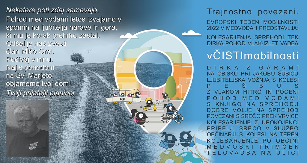 Redna večurna hoja utrjuje posameznike, ki so potem vajeni hoditi peš po opravkih, tudi ko niso v naravi. Hoje navajeni ljudje za svojo mobilnost vse manj posegajo po krmilih vozil. Planinsko društvo Medvode v naši lokalni skupnosti deluje že več kot sedemdeset let in je po številu članov eno največjih v občini. Z najdaljšim pohodom v okviru Evropskega tedna mobilnosti 2022 v Medvodah bo povezalo pohodnike v letošnjem sloganu »Trajnostno povezani.« Odidemo do Preske skozi podhod pod železnico in se počasi vzpenjamo proti Žlebom. Vrnemo se po drugačni poti. Kje? Naj ostane skrivnost.
