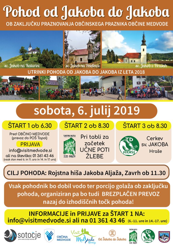 1. štart: pred Občino Medvode ob 6.30, odpeljemo vas pred POŠ Topol, kjer pot nadaljujete peš proti cerkvi sv. Jakoba na Katarini in nato proti cerkvi sv. Jakoba na Petelincu v Žlebeh.