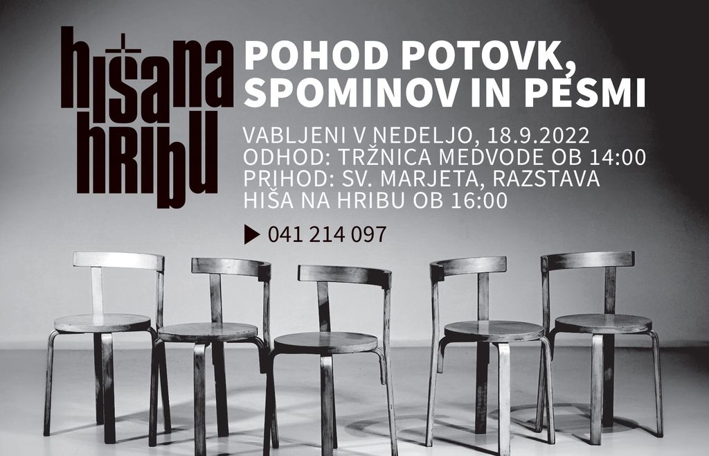 Vabimo vas, da se ob zaključku razstave Hiša na hribu 2022 srečamo na spominskem pohodu iz Medvod do sv. Marjete. Ustvarjalci projekta želimo na ta način počastiti spomin na Franca Cegnarja, enega prvih snovalcev vseprisotnosti kulture v Medvodah. S prenosom Potovk, branjem, petjem in pogovorom se 18.9.2022 ob 14.uri podamo na pot z Medvoške tržnice do Sv. Marjete, kjer v družabnem srečanju in z ogledom razstave zaključujemo letošnjo Hišo na hribu.