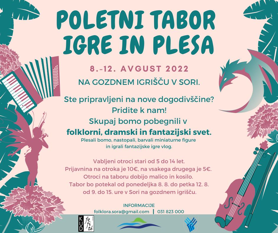 Poletni tabor igre in plesa združuje spoznavanje folklorne in dramske dejavnosti ter delavnico barvanja miniaturnih figur, izdelave maket ter delavnico fantazijskih iger vlog. Pri projektu se bosta združili folklorna in dramska sekcija KUD Oton Župančič Sora ter sekcija Amulet Kulturno umetniškega društva Fofité.