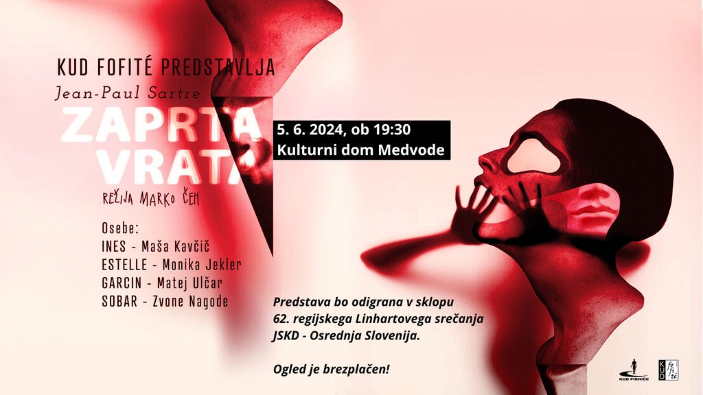 Vabimo vas na predstavo v sklupu Linhartevega srečanja: ZAPRTA VRATA, na katerem je bila večkrat nagrajena gledališke sekcije KUD-a Fofité, ki bo v sredo 5.6.2024, ob 19.30.