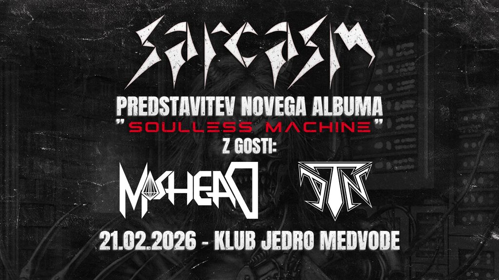 SARCASM Sarcasm se po petih letih od albuma Pot v raj vrača s povsem novo izdajo: Soulless Machine. Ostajamo zvesti svojemu brezkompromisnemu thrash pristopu — hitro, udarno in direktno, z besedili, ki se dotikajo sveta okoli nas. Kot že naslov albuma in naslovnica nakazujeta, Soulless Machine govori o spremembah, ki jih doživljamo v družbi. Z njim nadaljujemo našo rdečo nit družbenokritičnih tem — sistem, nadzor, manipulacija, upor, človeška povezanost in cena, ki jo plačujemo — le da je tokrat v ospredju nova doba AI. Na release partyju bomo v živo predstavili nove komade, zraven pa dodali tudi nekaj starejših klasik, da bo večer tak, kot mora biti: hitro, glasno in brezkompromisno.