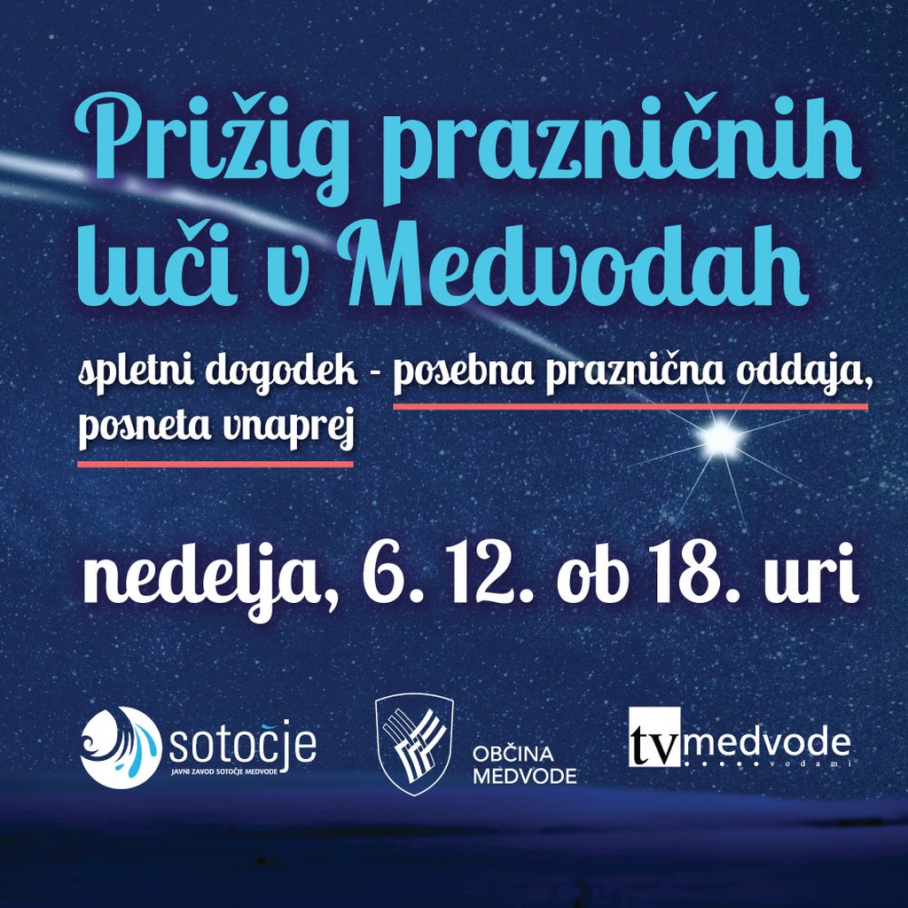 Prižig prazničnih luči v Medvodah bo letos žal potekal brez tradicionalne prireditve z nastopi otroških pevskih zborov medvoških osnovnih šol. Vseeno pa smo se prilagodili razmeram in pripravili prav posebno oddajo, s katero bomo pričarali vsaj nekaj čarobnosti ob začetku veselega decembra, v sklopu oddaje pa se bodo prižgale tudi praznične luči v Medvodah.