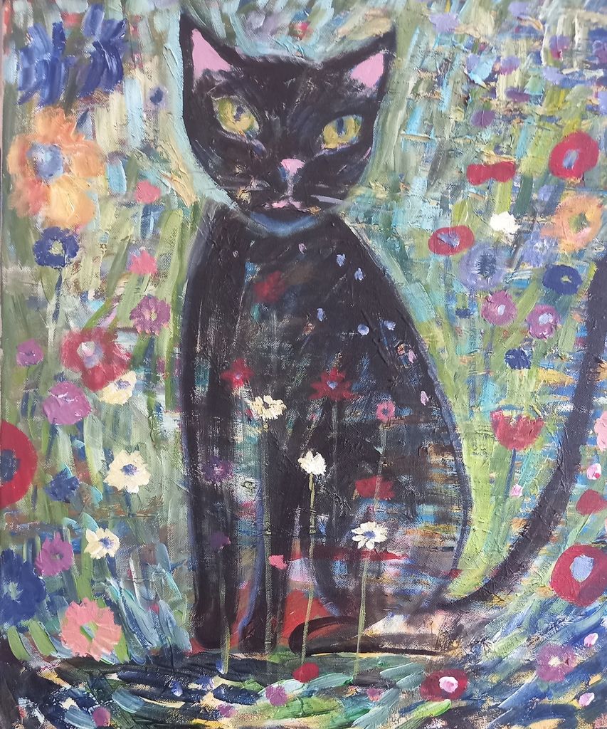 Tokratna razstava je posvečena mačkam in pticam v labirintu barv. Živali ji služijo kot stalna inspiracija, saj se vedno znova navdušuje nad njimi.