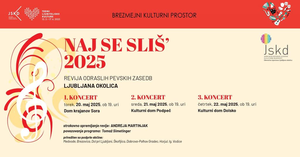 na območju JSKD Ljubljana okolica se v Brezmejni kulturni prostor Tednov ljubiteljske kulturevključujemo s tremi koncerti pevske revije NAJ SE SLIŠ' 2025, na kateri bo v treh krajih zapelo 26 pevskih zasedb!