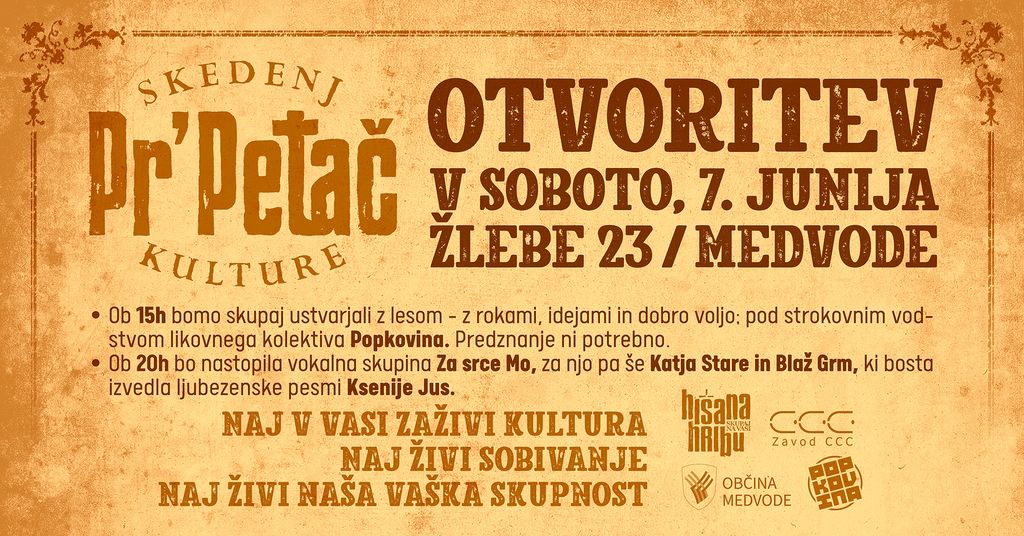 Z velikim veseljem vas obveščam, da se v naši vasi odpira nov prostor za kulturo, skupnost in srčne vezi. Poleg hiše Pr’ Petač (Žlebe 23) bomo za vas odprli vrata majhnemu, a toplemu kotičku, kjer se bomo lahko srečevali, ustvarjali in soustvarjali. V duhu projekta Hiša na hribu, ki ljudi pove- zuje skozi umetnost, besedo in pris(o)tnost, bo tudi ta prostor namenjen razstavam, koncertom, delavnicam, predavanjem, druženju ... In objemu prijatelja. Graditi želimo prostor za skupno dobro – s potrpežljivostjo, občutkom in odprtim srcem. Korak za korakom.