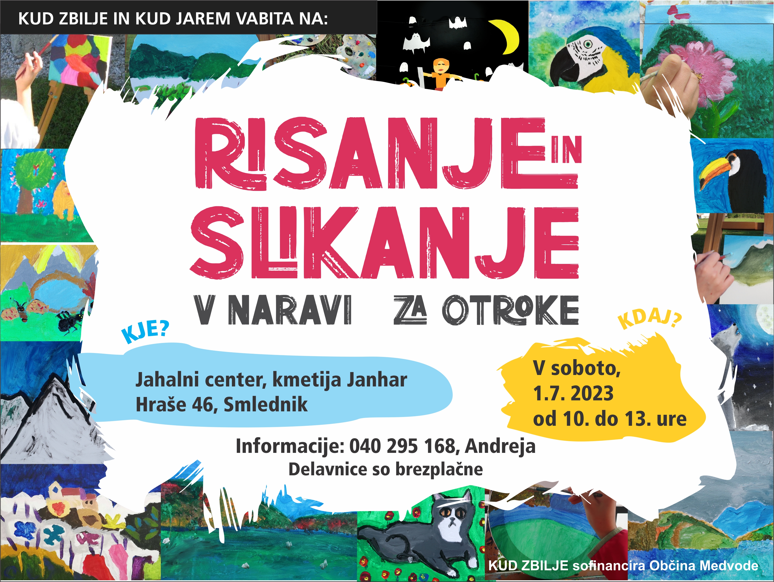 KUD Zbilje vabi na slikarske delavnice za otroke, ki bodo v soboto, 1.7. 2023. Tokrat ustvarjamo v jahalnem centru na kmetiji Janhar, Hraše46, Smlednik. Delavnice za otroke so brezplačne. Informacije: andreja.erzen@gmail.com