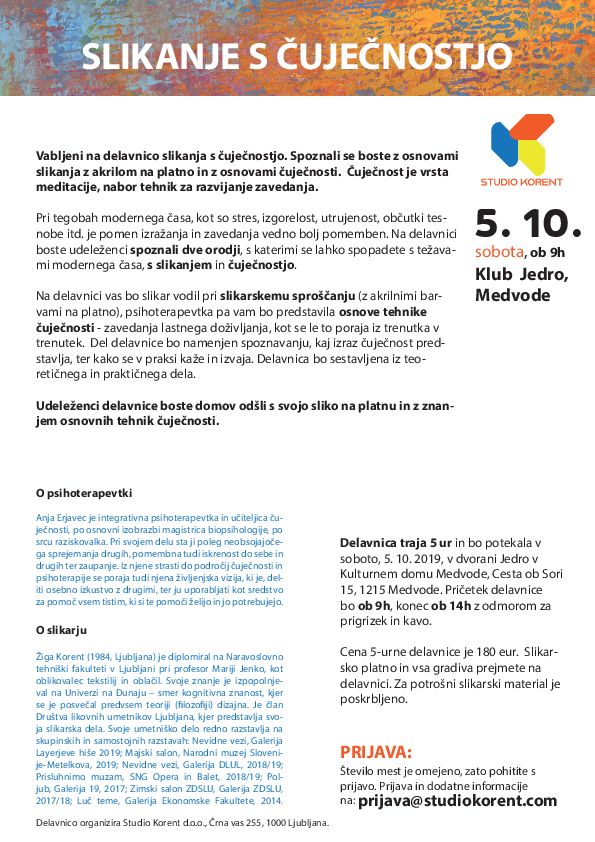 Kontaktni podatki organizatorja: Studio Korent, prijava@studiokorent.com , +386 (0)1 361 43 46.