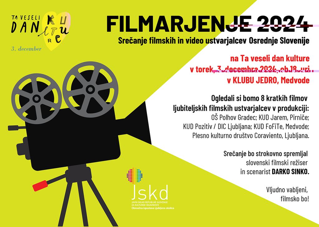 Regijsko srečanje filmskih ustvarjalcev Osrednje Slovenije je tradicionalna prireditev, kjer se na osnovi razpisa predstavijo ustvarjalci vseh starosti s svojimi kratkimi filmi. Srečanje bo strokovno spremljal filmski režiser in scenarist Darko Sinko.