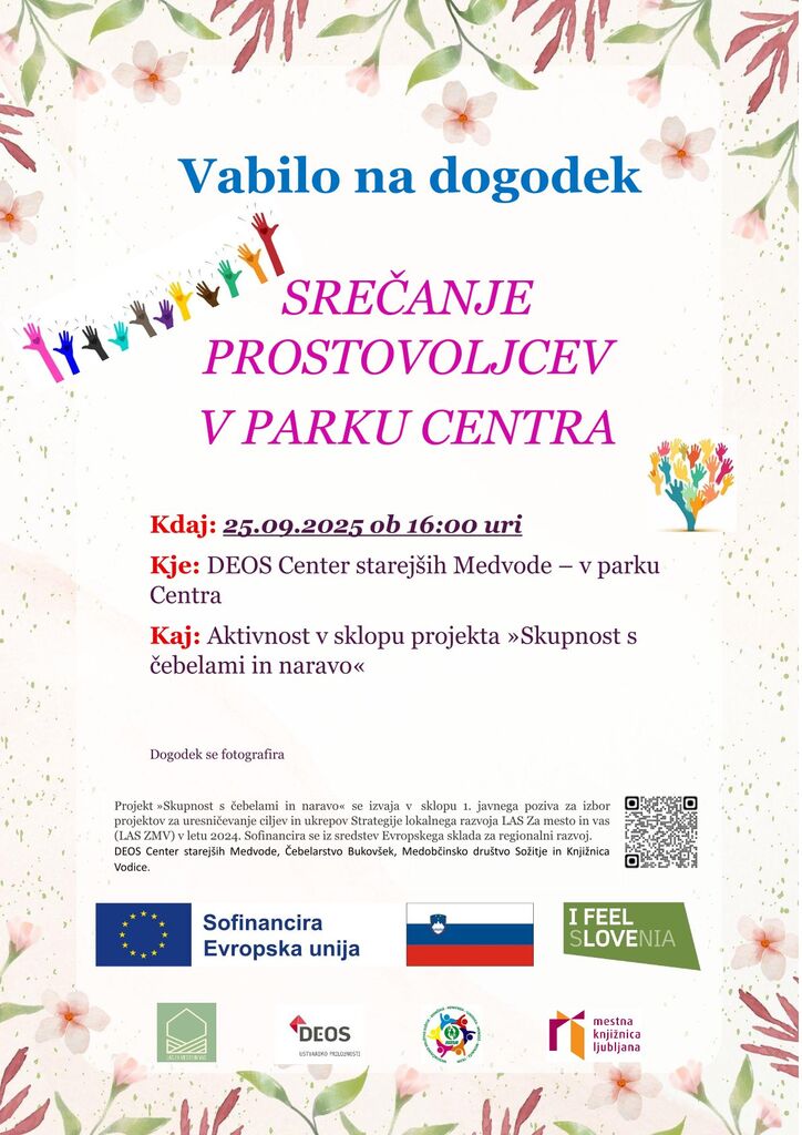 V okviru projekta ˝Skupnost s čebelami in naravo˝ vas vabimo na dogodek Srečanje prostovoljcev, ki delujejo v Deos Centru starejših Medvode, ki bo potekal v novem parku. Vabljeni tudi vsi, ki bi radi postali prostovoljci. V primeru slabega vremena se bo dogodek izvedel v notranjih prostorih. Poskrbljeno bo za manjšo pogostitev.