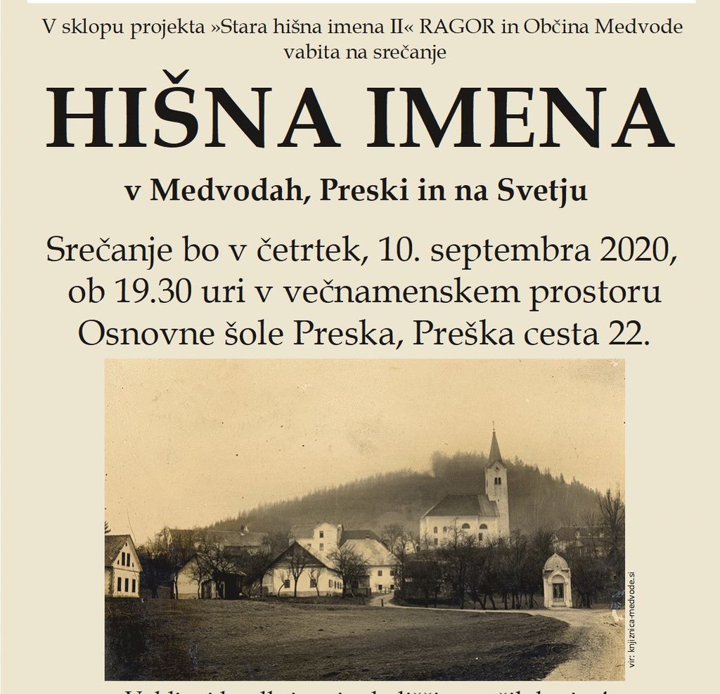 V sklopu projekta »Stara hišna imena II« RAGOR in Občina Medvode vabita na srečanje meščanov mesta Medvode, kjer bomo odkrivali stara hišna imena v naselju Medvode (Medvode, Preska, Svetje). Srečanje bo v četrtek, 10. septembra 2020, ob 19.30 v večnamenskem prostoru Osnovne šole Preska (Preška cesta 22, 1215 Medvode).