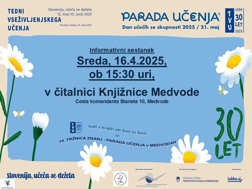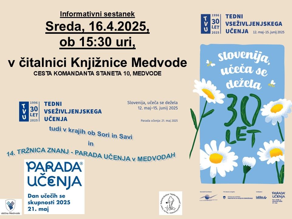Tedni vseživljenjskega učenja 2025 bodo!.. tudi v krajih ob Sori in Savi. Vabljeni na INFORMATIVNI SESTANEK, v sredo, 16.4.2025 ob 15:30 uri v čitalnico Knjižnice Medvode!