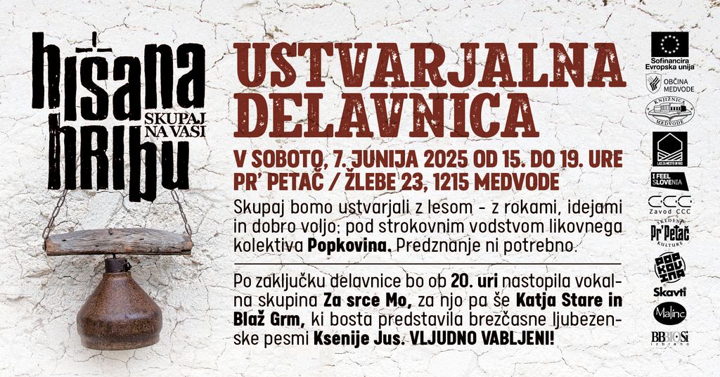 V novem prostoru Skedenj kulture Pr' Petač v vasi Žlebe za vas pripravljamo skupnostno ustvarjalno delavnico z lesom – z rokami, idejami in dobro voljo. Delavnica bo potekala pod strokovnim vodstvom likovnega kolektiva Popkovina in Hiše na hribu.