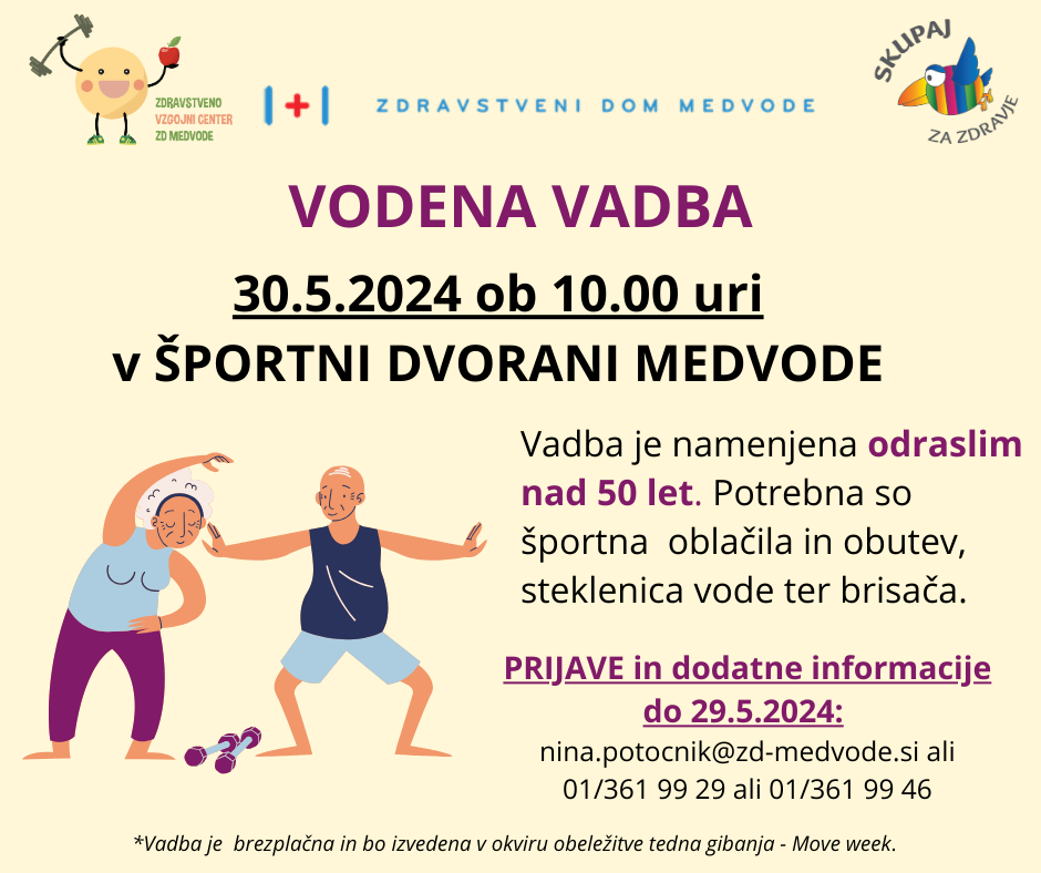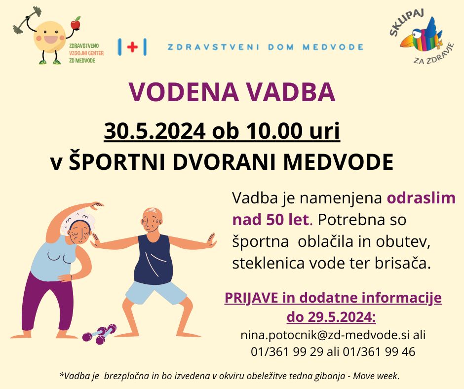 V okviru tedna gibanja vas vabimo, 30.5.2024 ob 10.00 uri, na vodeno vadbo v športno dvorano Medvode.