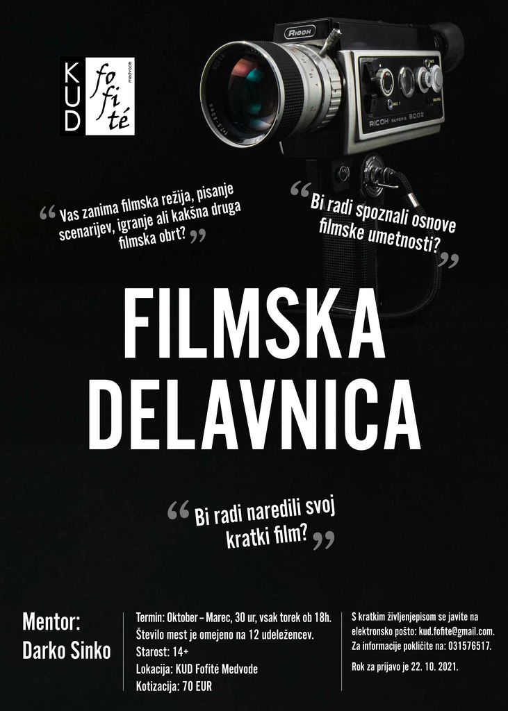 Delavnica bo imela svoj teoretični in praktični del. Vključevala bo osnove vizualne podobe, njenih zakonitosti in njen zgodovinski razvoj. V nadaljevanju bo na osnovi ogleda filmov iz starejše in novejše zgodovine odstirala osnove filmske umetnosti in značilnosti njene pripovedi. V zadnjem delu bodo slušatelji s pomočjo mentorjev poskušali ustvariti svojo filmsko pripoved krajšega formata, od scenarija do snemanja na terenu. Namenjena je starejšim od 14 let, ki jih zanima pripovedovanje zgodbe skozi sliko. Število slušateljev do 12.