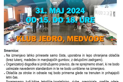 Občina Medvode v sodelovanju z Javnim zavodom Sotočje Medvode in Fundacijo Vincenca Drakslerja vabi na izmenjevalnico odraslih in otroških oblačil, ki bo potekala v petek, 31. maja 2024, med 15. in 18. uro, v prostorih mladinskega centra Klub Jedro (Cesta ob Sori 15, 1215 Medvode).