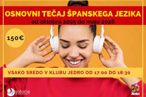 🇪🇸✨ Zopet odpiramo prijave za osnovni tečaj španskega jezika! Potekal bo od oktobra 2025 do maja 2026, in sicer ob sredah od 17.00 do 18.30 v Klubu Jedro v Medvodah.