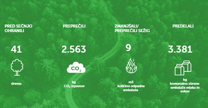 Merimo učinke in vpliv na okoljeSodelujoči partnerji v Medvodah smo tako v letu 2023 pred sečnjo ohranili 41 dreves oziroma 164 m2 gozda. Reciklirali smo 90.055 kosov oziroma 3.381 kilogramov odpadne embalaže tetrapak. S tem smo zmanjšali emisije CO2 za 2.563 kilogramov in preprečili sežig oziroma odlaganje 9 m3 odpadne embalaže.