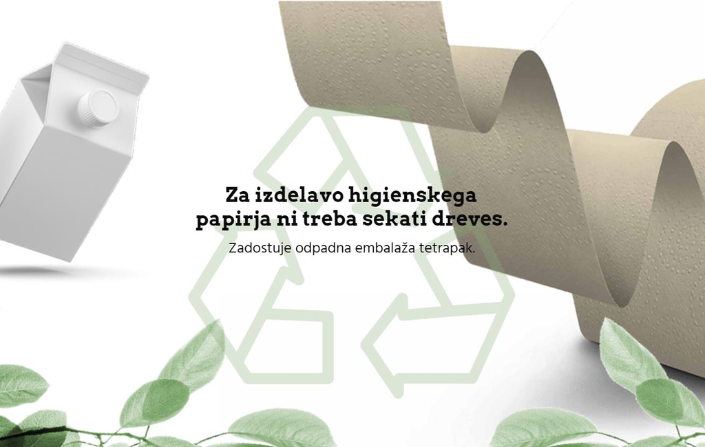 Za izdelavo higienskega papirja ni treba sekati drevesVsak listič recikliranega higienskega papirja iz sekundarne surovine razbremenjuje okolje. Namesto sečnje dreves in izčrpavanja narave v našem krožnem modelu ponovno uporabimo surovine iz odpadkov. Tetrapake, ki jih občanke in občani pravilno ločujemo in oddamo v rumene zabojnike, Javno podjetje VOKA Snaga zbere in preda družbi za ravnanje z odpadno embalažo, ki embalažo sortira in pripravi za recikliranje. Embalažo nato preda papirnici, ki iz odpadnih tetrapakov izdela higienski papir. Distributer higienski papir dostavi javnim ustanovam, ki ga vsakodnevno uporabljajo v kuhinjah in toaletnih prostorih. Ločeno zbrana odpadna embalaža se tako uporabi kot sekundarni vir celuloze in se vrne v isto lokalno skupnost kot reciklirani higienski papir.
