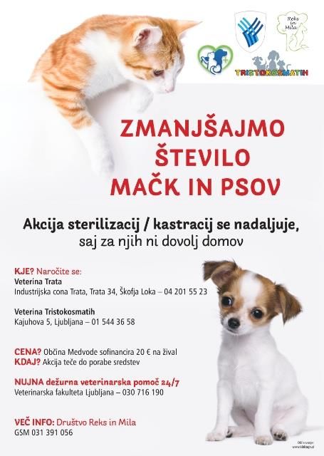 Akcija sterilizacij in kastracij mačk in psov je projekt, s katerim želimo preprečiti in omejiti nova mačja in pasja legla. Končajo kot zavržene, potepuške mačke, za katere nihče ne skrbi. Med seboj se množijo, so bolne in bolezen širijo med svojo populacijo. Nekatere bolezni so prenosljive tudi na pse in na človeka. Veliko število živali pogine zaradi bolezni ali pod kolesi avtomobilov. Okužijo lahko lastniške mačke, ki niso pod nadzorom lastnikov.