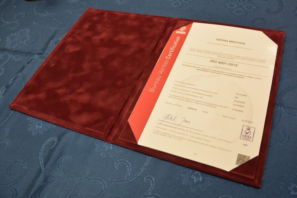 Certifikacijska hiša Bureau Veritas d.o.o. je, po uspešni certifikacijski presoji, Občini Medvode podelila certifikat ISO 9001:2015. Direktorici Občinske uprave Občine Medvode Aniti Mežek je certifikat predal Tomaž Verbnik, direktor Bureau Veritas.