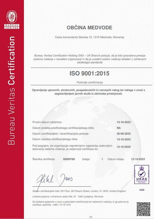 Občina Medvode je v letošnjem letu izvedla vse potrebne postopke za certificiranje po mednarodnem standardu za vodenje kakovosti ISO 9001:2015 za opravljanje upravnih, strokovnih, pospeševalnih in razvojnih nalog ter nalog v zvezi z zagotavljanjem javnih služb iz občinskih pristojnosti. Na začetku poti smo sprejeli tudi Politiko kakovosti, ki jo najdete na naši spletni strani. Po definiranju procesov skladno s standardom, prepoznanju tveganj in priložnosti, določitvi kazalnikov kakovosti in strateških ciljev smo izvedli notranjo presojo in vodstveni pregled, konec septembra pa je sledila tridnevna certifikacijska presoja s strani vodilne certifikacijske hiše Bureau Veritas.