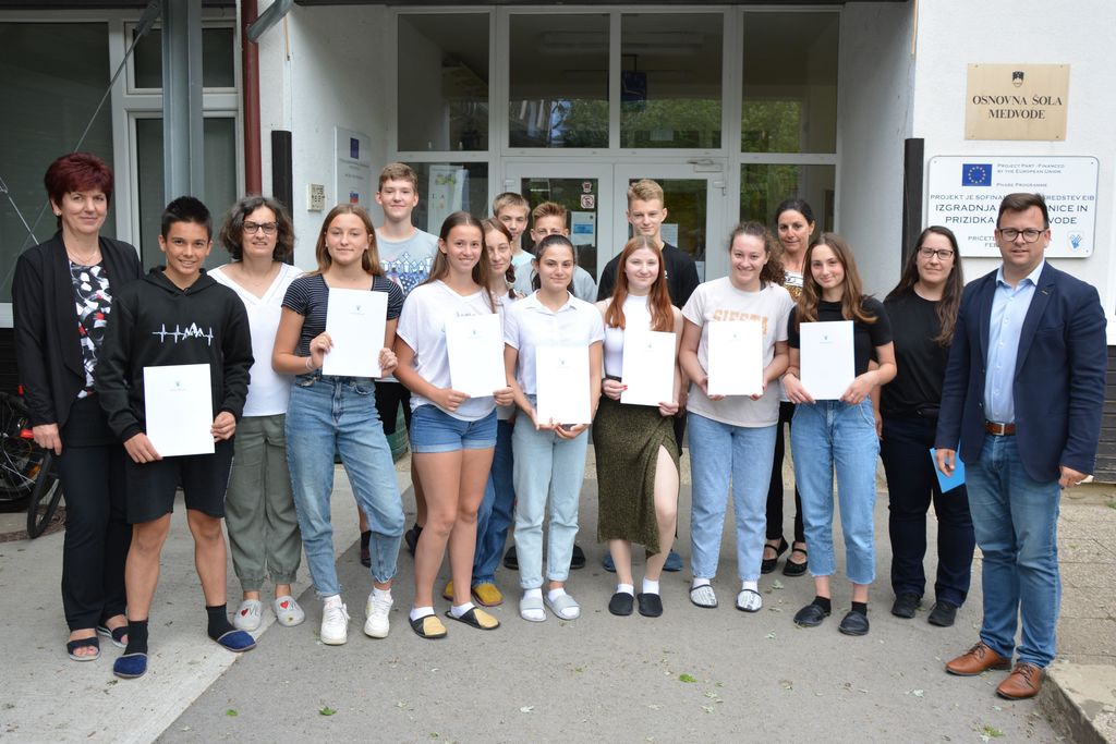 Najuspešnejši devetošolci so prejeli županovo priznanje za izjemne dosežke v času šolanja in drobno pozornost, vstopnice za dogodke Poletje med vodami. Še enkrat čestitamo vsem najbolj uspešnim devetošolcem in vsem ostalim, ki ta teden uspešno zaključujejo šolanje na medvoških osnovnih šolah.