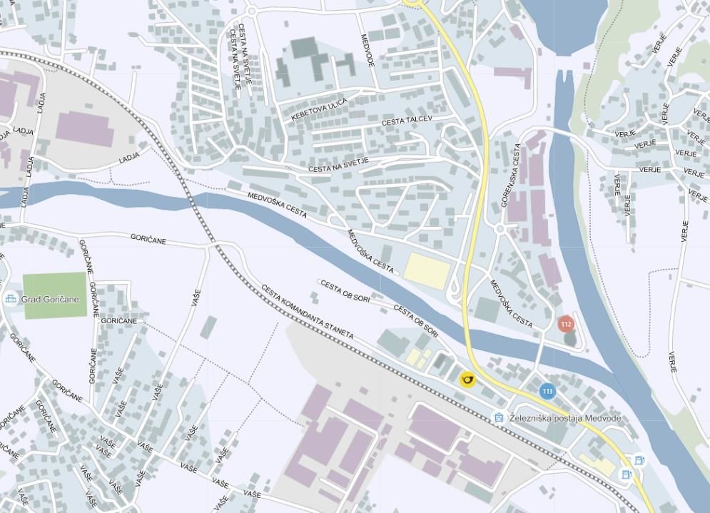 Pelje mimo zadružnega doma ob Sori proti Goričanam.