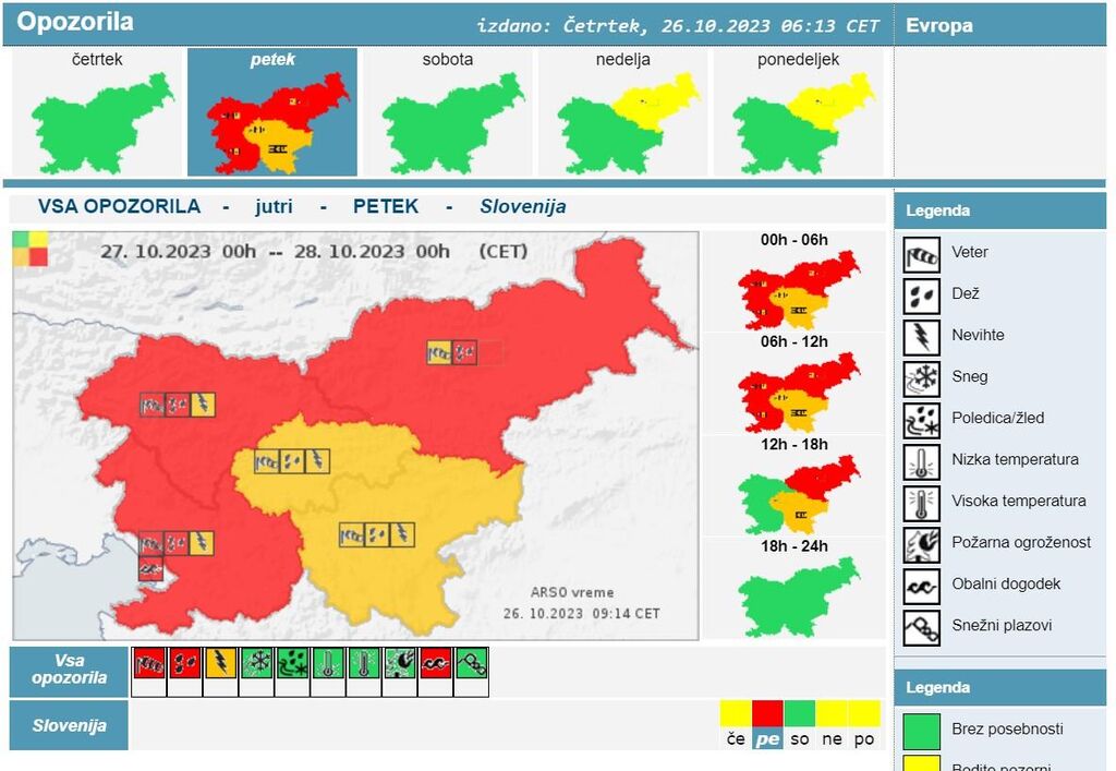 Obvestilo ARSO: »Po Sloveniji tako predvsem v drugem delu noči na petek ter v petek zjutraj pričakujemo zelo burne vremenske procese. Nad našimi kraji se bo močno okrepil jugozahodni veter, zajelo pa nas bo tudi intenzivno deževje z nalivi.