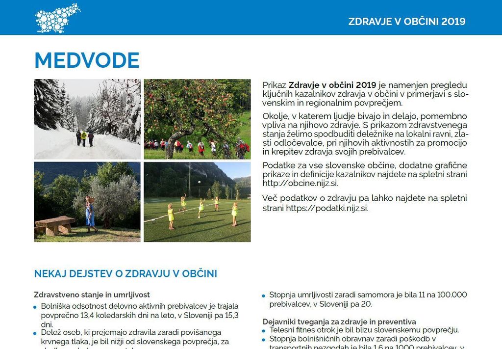 Nacionalni inštitut za javno zdravje (NIJZ) je pripravil posodobljene podatke o zdravju prebivalcev v slovenskih občinah. Objavljeni so na spletni strani Zdravje v občini v zavihku 2019. Z omogočanjem boljše dostopnosti in dosegljivosti zdravstvenih podatkov na nivoju lokalne skupnosti želi NIJZ spodbujati krepitev zdravja in preprečevanje bolezni v okoljih, kjer ljudje živijo in delajo.