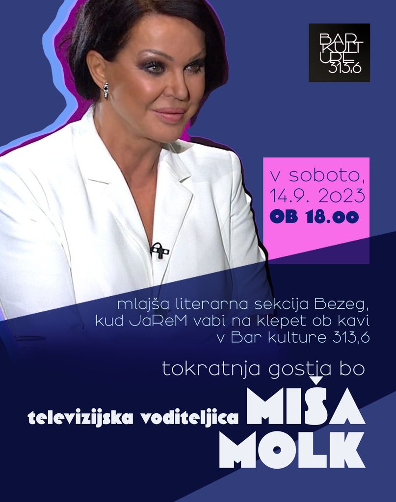 V soboto 14.10. ob 18h gostimo mlajšo sekcijo KUD-a JaReM, ki so tokrat na klepet povabili televizijsko voditeljico Mišo Molk. Isti večer v baru gostimo tudi barmana Roka in DJ-a (((X))), ki bosta sobotni večer pozno v noč barvala z okusi in zvoki z vseh vetrov.