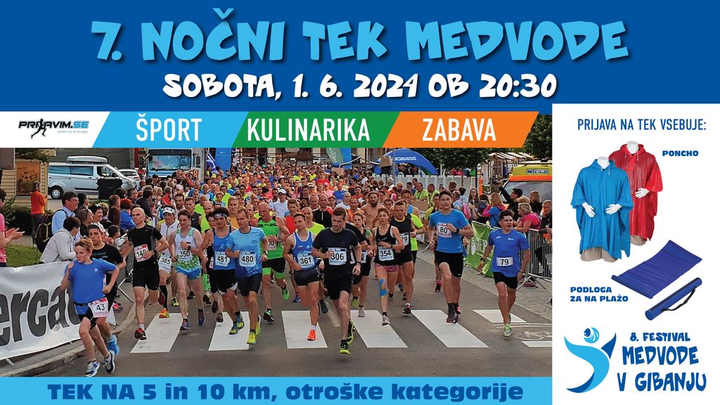 Razglasitev 7. NOČNEGA TEKA MEDVODE bo ob cca 22. uri. Sledilo bo športno- zabavno druženje, okrepčali pa se boste lahko na kulinarični tržnici Okusi Sotočja. Celoten program si lahko ogledate www.festivalmedvode.si.