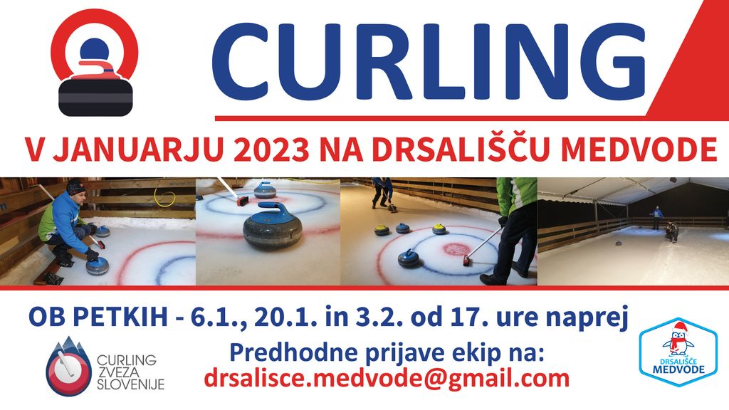 V januarju in februarju 2023 bo na Drsališču Medvode mogoče igrati curling. Na voljo bo poligon kot strokovno vodstvo. Vabljeni na drsališče ob petkih - 6.1., 20.1., 3.2. od 17. ure naprej. Prijavite se lahko na drsalisce.medvode@gmail.com.