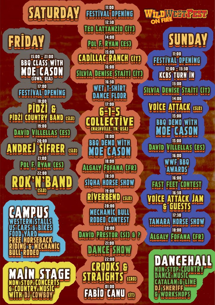 Tridnevni country in BBQ festival vam bo ponudil plesne country delavnice pod vodstvom najboljših evropskih koreografov, mednarodno BBQ tekmovanje, BBQ delavnice, nastope country glasbenih skupin, razstavo ameriških vozil, brezplačno jahanje konj in mehanskega bika, konjeniški šov, western stojnice, bogato tematsko kulinarično ponudbo in še mnogo več.